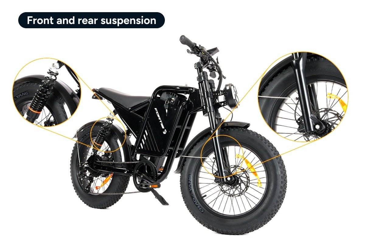 The fat 20” x 4” tyres paired with front and rear suspension soak up shocks, bumps and uneven ground. Whether you’re on the road, gravel or dirt, the FatBro Plus keeps your ride stable, cushioned and enjoyable.